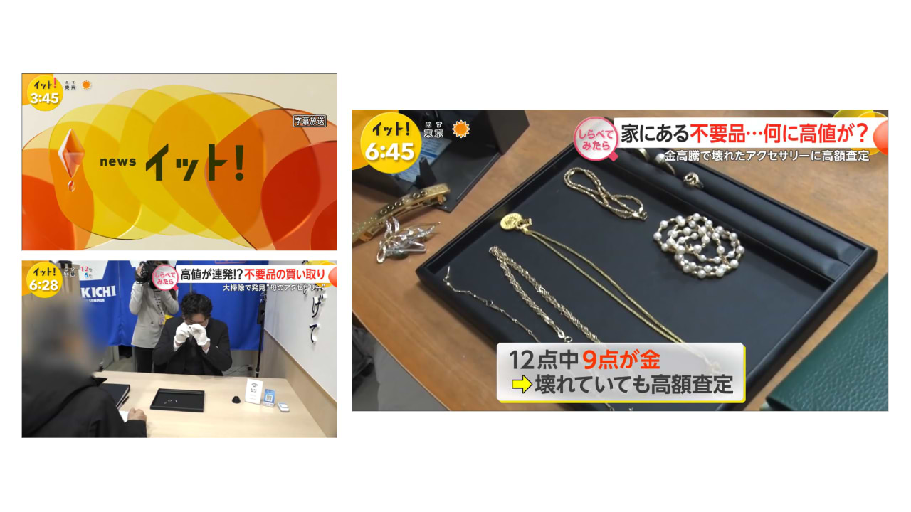 1月28日(火)放送 フジテレビ『イット!』で、 「買取大吉」銀座中央通り店・渋谷文化村通り店・出張での買取の様子をご紹介いただきました。 VTRには、弊社鑑定士・林と北田が出演いたしました。 これからもお客様満足度の向上に向けて邁進してまいりますので、 変わらぬご愛顧を賜りますようお願い申し上げます。 この記事の投稿者:買取大吉 フランチャイズ事業部金、ジュエリー、時計、バッグなど、リユース品の買取を専門に行っている「買取大吉」のフランチャイズ事業部。日本全国に1000店舗以上を展開する組織力と、店舗継続率96.4%を誇る知見をもとに、フランチャイズ事業に関する様々な情報を発信いたします。この投稿者の記事を見る
